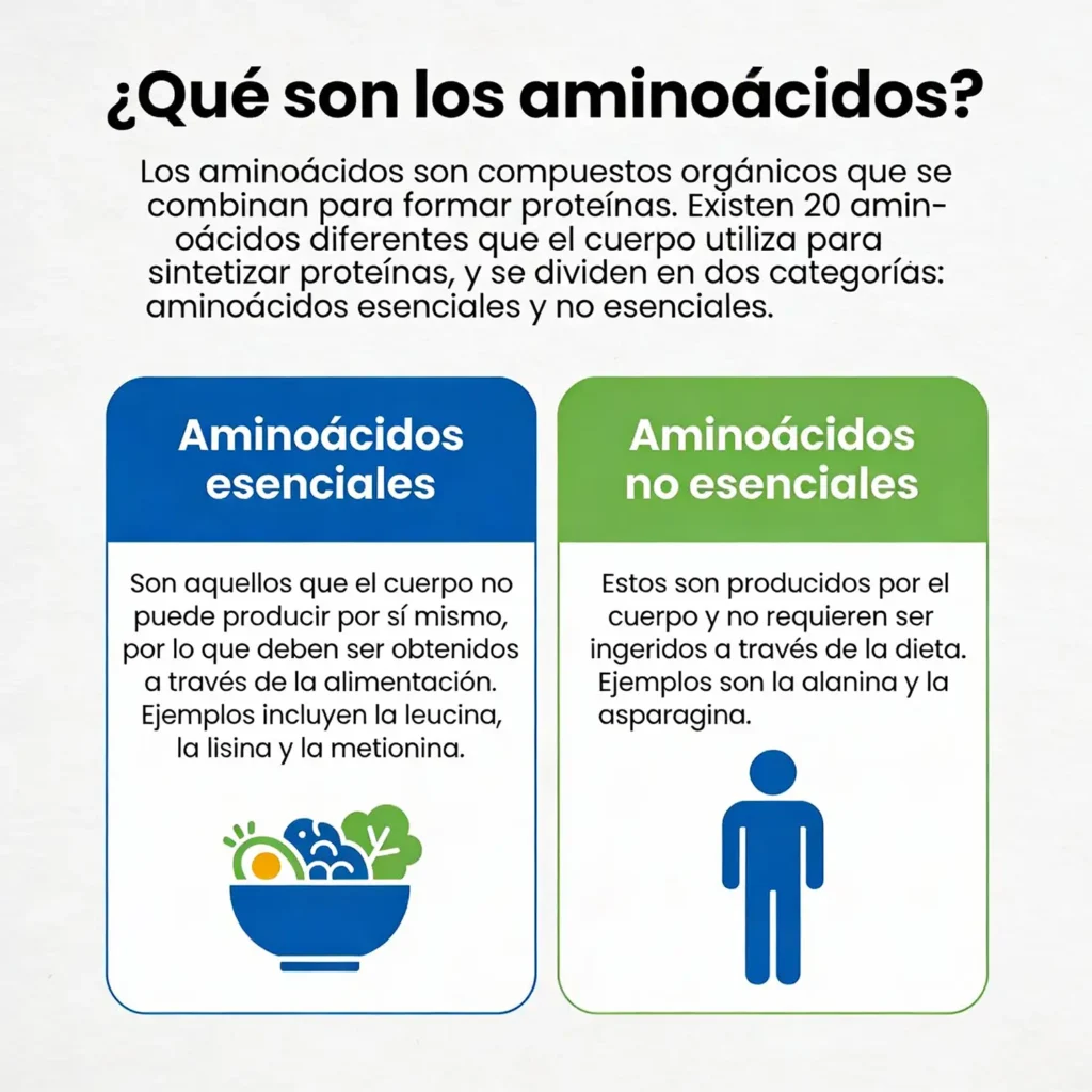 Los aminoácidos son compuestos orgánicos que se combinan para formar proteínas. Existen 20 aminoácidos diferentes, de los cuales nueve son considerados esenciales, lo que significa que el cuerpo no puede producirlos y deben ser obtenidos a través de la dieta. Estos aminoácidos esenciales son: lisina, metionina, treonina, triptófano, valina, leucina, isoleucina, fenilalanina y histidina.