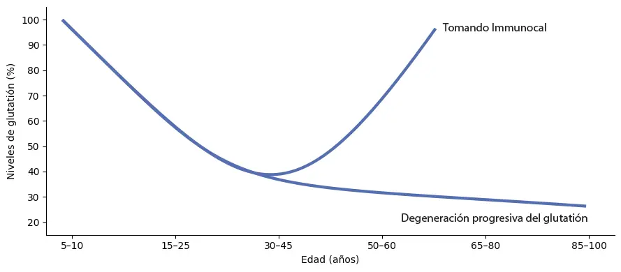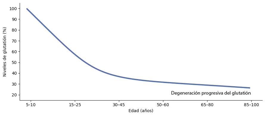 En el gráfico de “degeneración progresiva del glutatión” se representa una idea común en divulgación: con el paso del tiempo puede observarse una tendencia al descenso de los niveles de glutatión. No se trata de un “fallo” del cuerpo, sino de una consecuencia lógica de un organismo que, a lo largo de los años, afronta más demandas y necesita una mayor capacidad de recuperación.