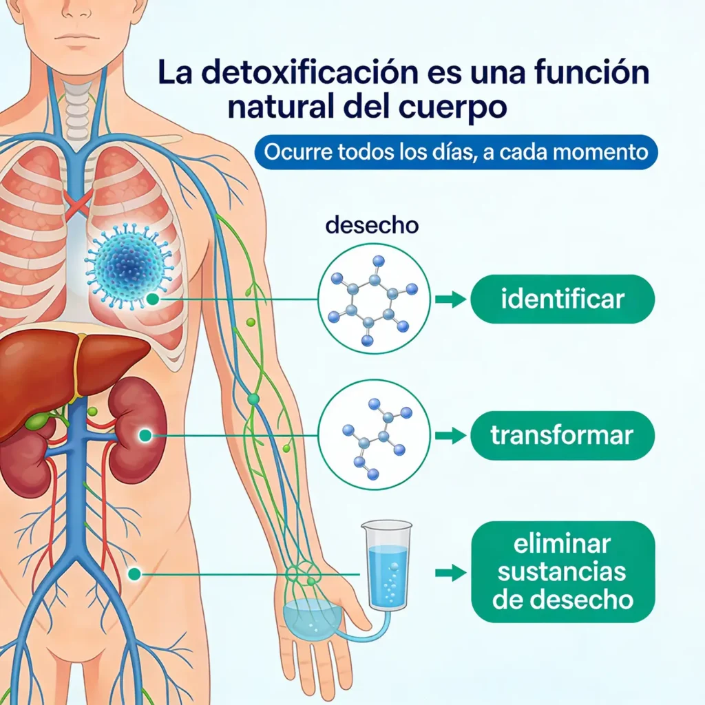 La detoxificación es una función natural del cuerpo. Ocurre todos los días, a cada momento, gracias a sistemas internos diseñados para identificar, transformar y eliminar sustancias de desecho.